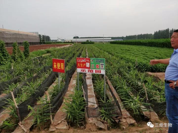 大姜撤膜小培土?xí)r農(nóng)戶及時(shí)施用三炬微生物菌劑。